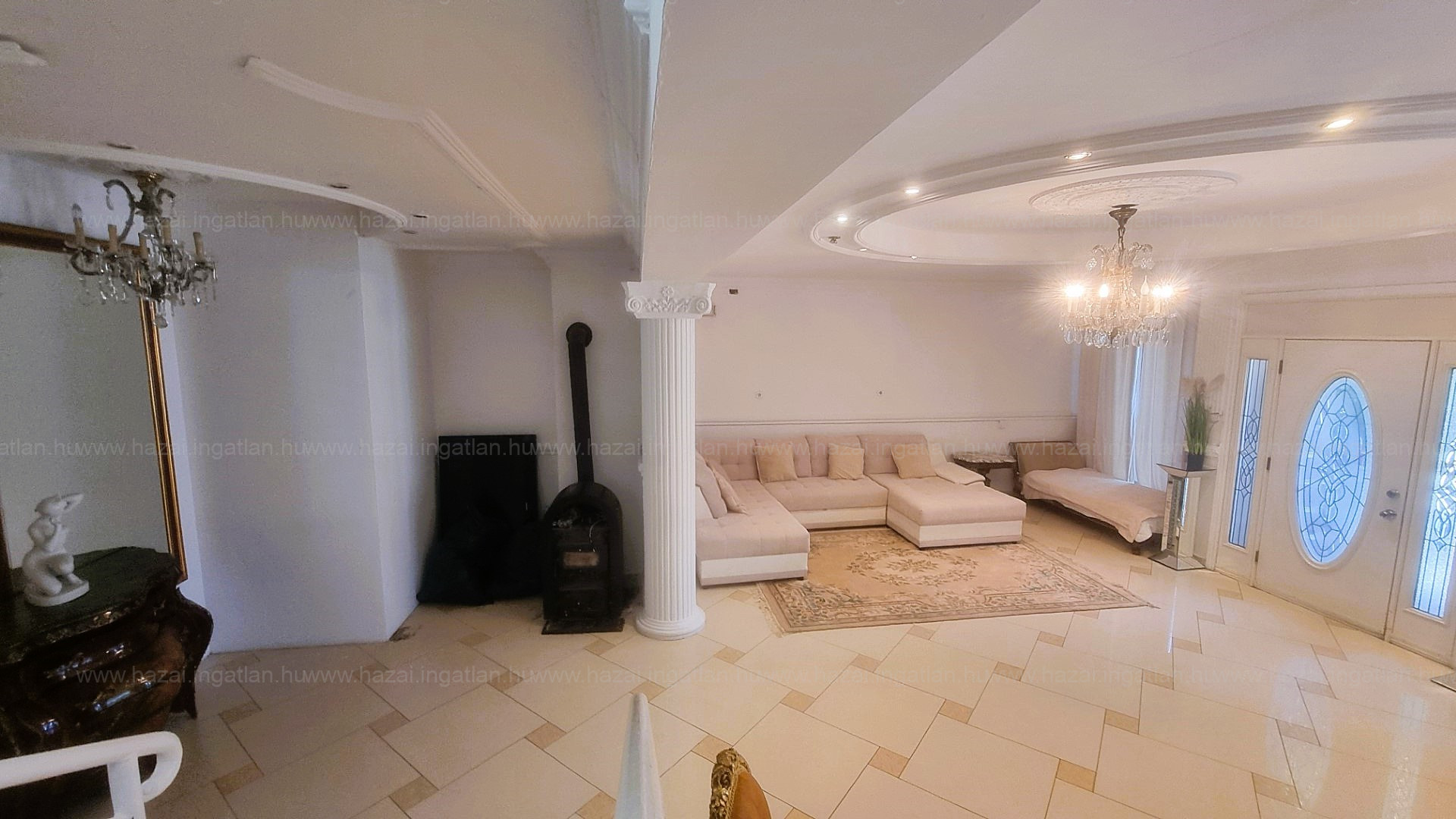 Az ingatlanba lépve egy hatalmas, világos nappaliba jutunk. Itt kapott helyet az étkező és ezen a szinten található még egy tároló helyiség és a lépcső.