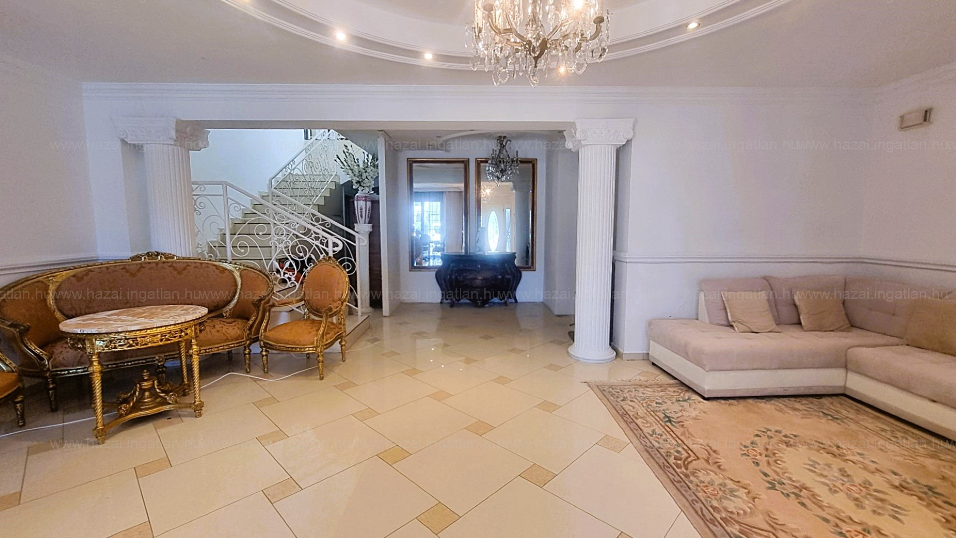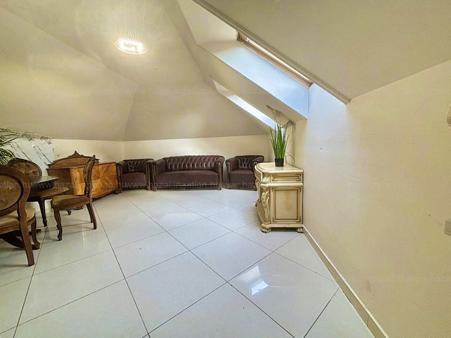 Az ingatlanba lépve egy hatalmas, világos nappaliba jutunk. Itt kapott helyet az étkező és ezen a szinten található még egy tároló helyiség és a lépcső.