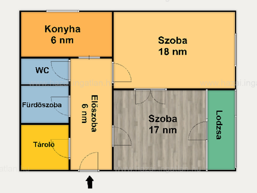 A lakásba lépve balra található egy kényelmes tároló, jobbra a szoba és egy beépített lodzsa, továbbhaladva balra a kádas fürdőszoba és a WC található. A bejárattal szemben a folyosó végén helyezkedik el a konyha, jobbra a másik szoba. A szobák külön, de egybe is nyithatók.