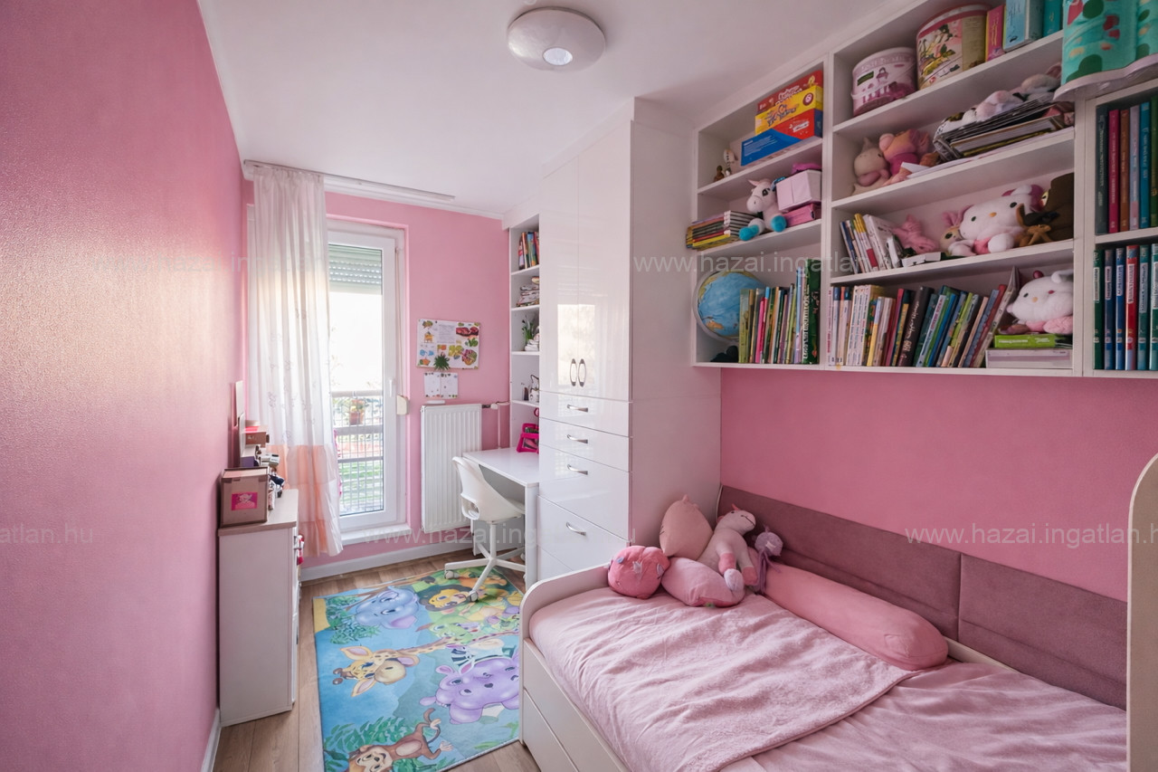 A gyermekszobában egy egyedileg készített, beépített „hercegnő” gardróbrendszer kerül beépítésre, amely praktikus tárolást biztosít, miközben bájos, különleges hangulatot teremt – egy olyan részlet, amibe szinte azonnal bele lehet szeretni.